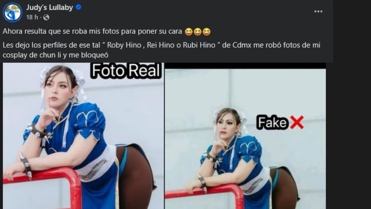 El caso comenzó a ganar visibilidad luego de que Judy’s Lullaby, cosplayer y creadora de contenido con una presencia consolidada en Facebook, denunciara abiertamente en sus redes sociales que sus fotografías de cosplay habían sido tomadas sin consentimiento. En su mensaje, explicó que las imágenes fueron manipuladas digitalmente para sustituir su rostro, una práctica que no solo borra la autoría original, sino que también distorsiona la identidad del trabajo creativo. Judy hizo un llamado directo a su comunidad para reportar los perfiles implicados, señalando que, tras detectar el uso indebido de su material, fue bloqueada por la cuenta denunciada.